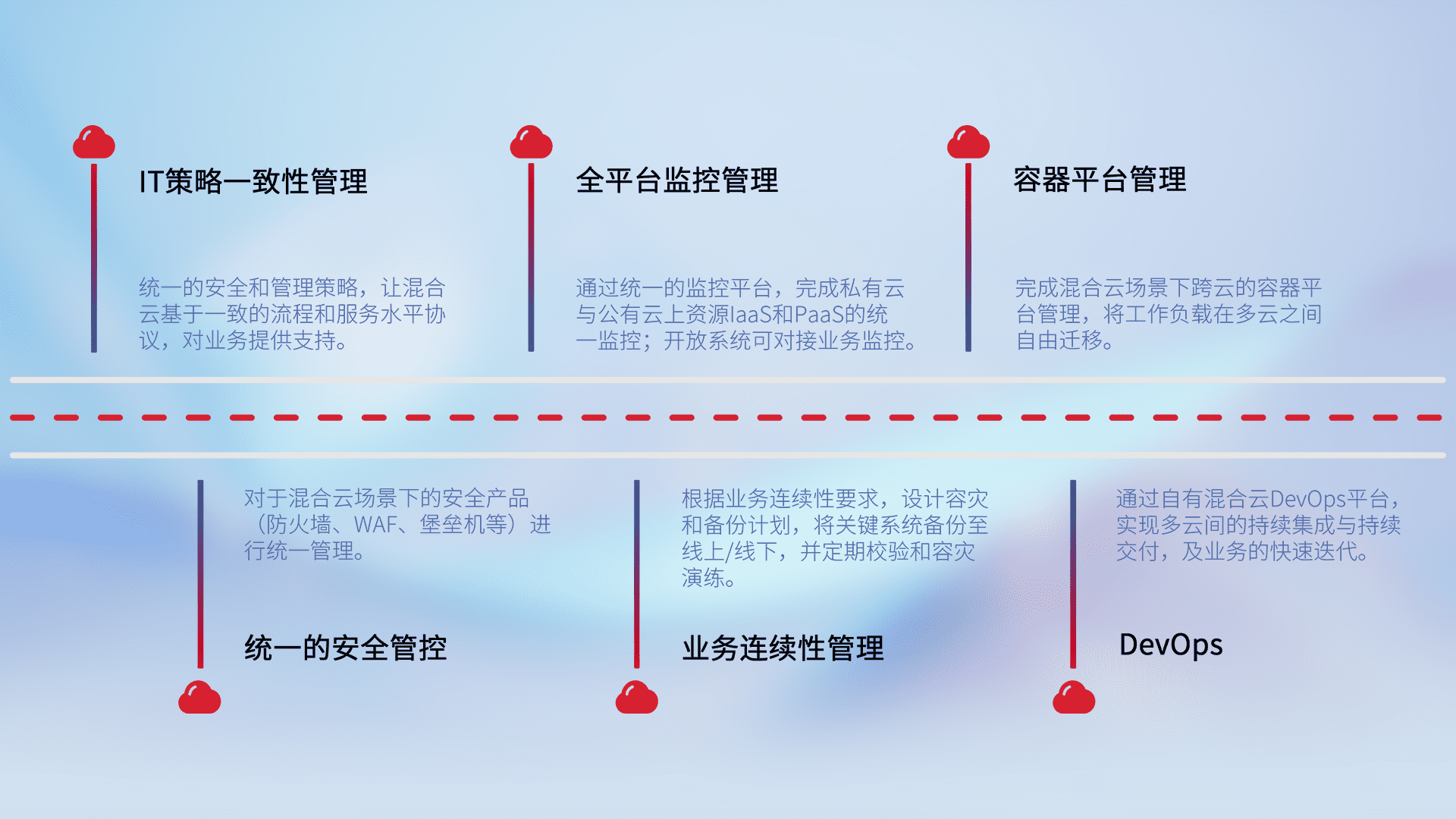 通过多云纳管,,,以统一的资源数据模型把客户的云资源进行抽象和封装,,,进而实现对多云资源的统一操作,,,,保障云资源管理的可靠性、、、稳定性与可用性。。。量身定制化运维内容,,,配置、、开发运维、、、、补丁管理、、、、备份、、、监控、、、、认证和访问管理、、审计和日常巡检等,,,保障在用云过程中的可靠度,,稳定度以及高可用率。。。