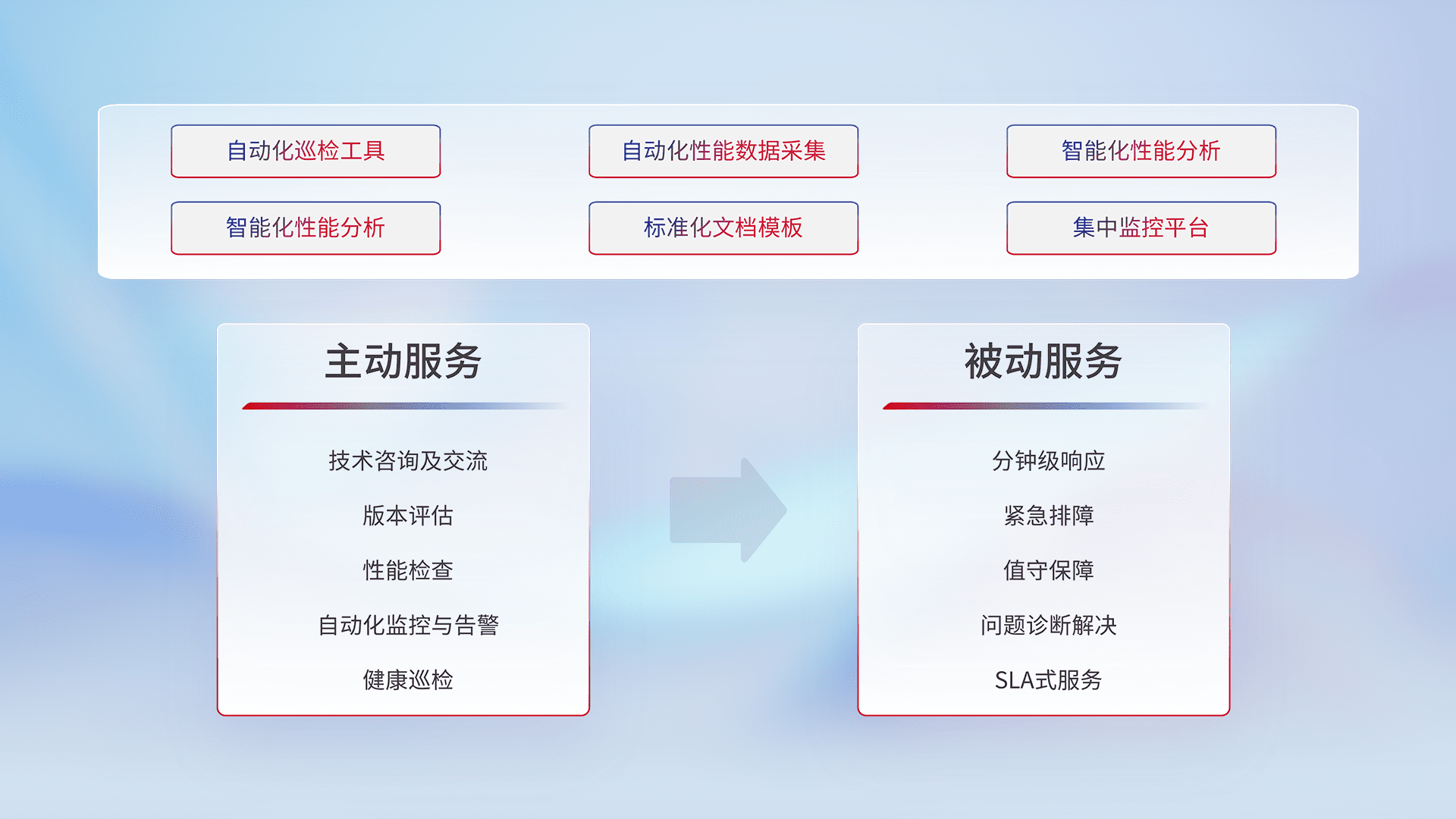 智能化工具和标准化文档,,保障服务质量,,,,提供主动服务(包含技术咨询、、、、版本评估、、、、性能检查、、、、自动化监控与告警、、、、健康巡检)和被动服务包含(分钟级响应、、紧急排障、、、、值守保障、、问题诊断解决、、、SLA服务)。。。。